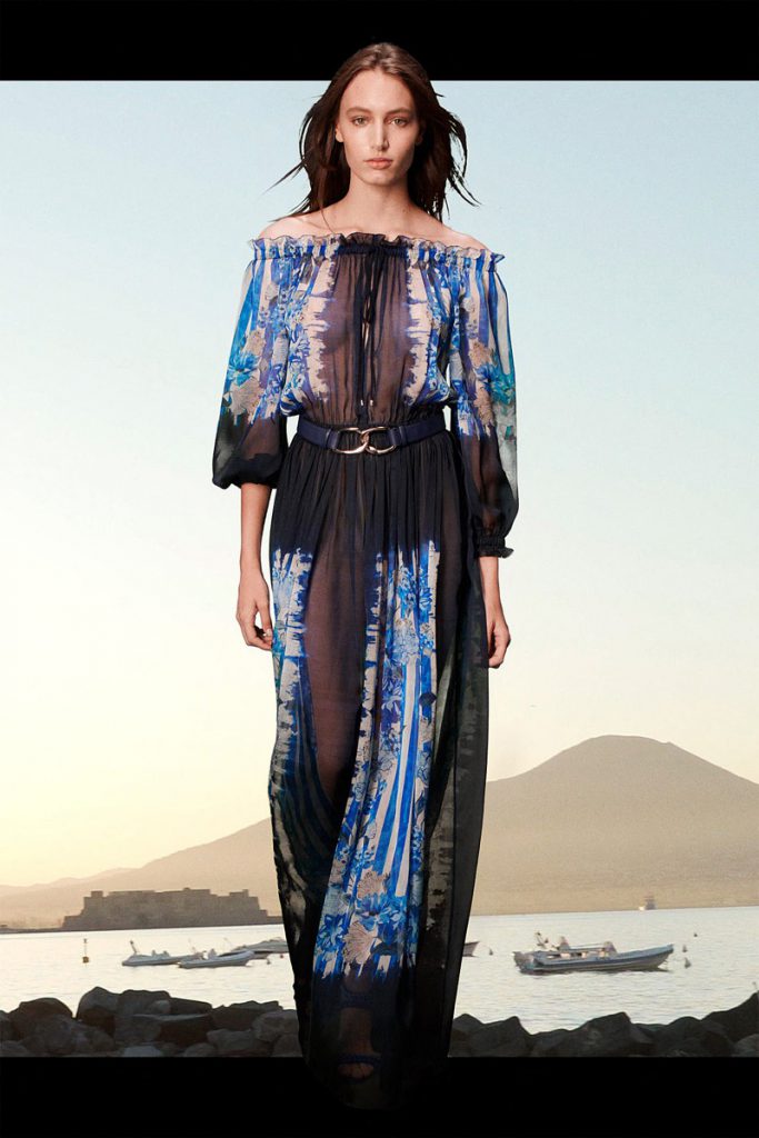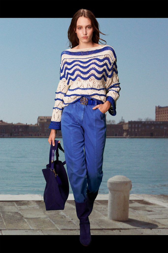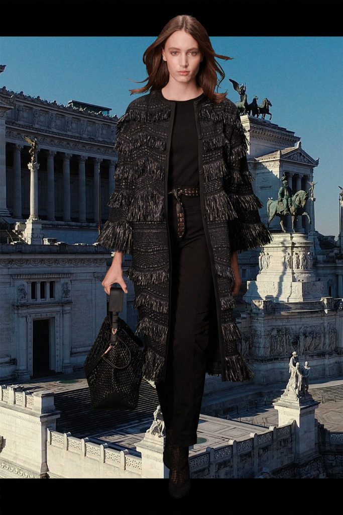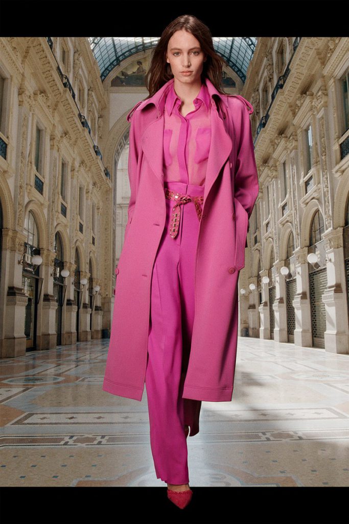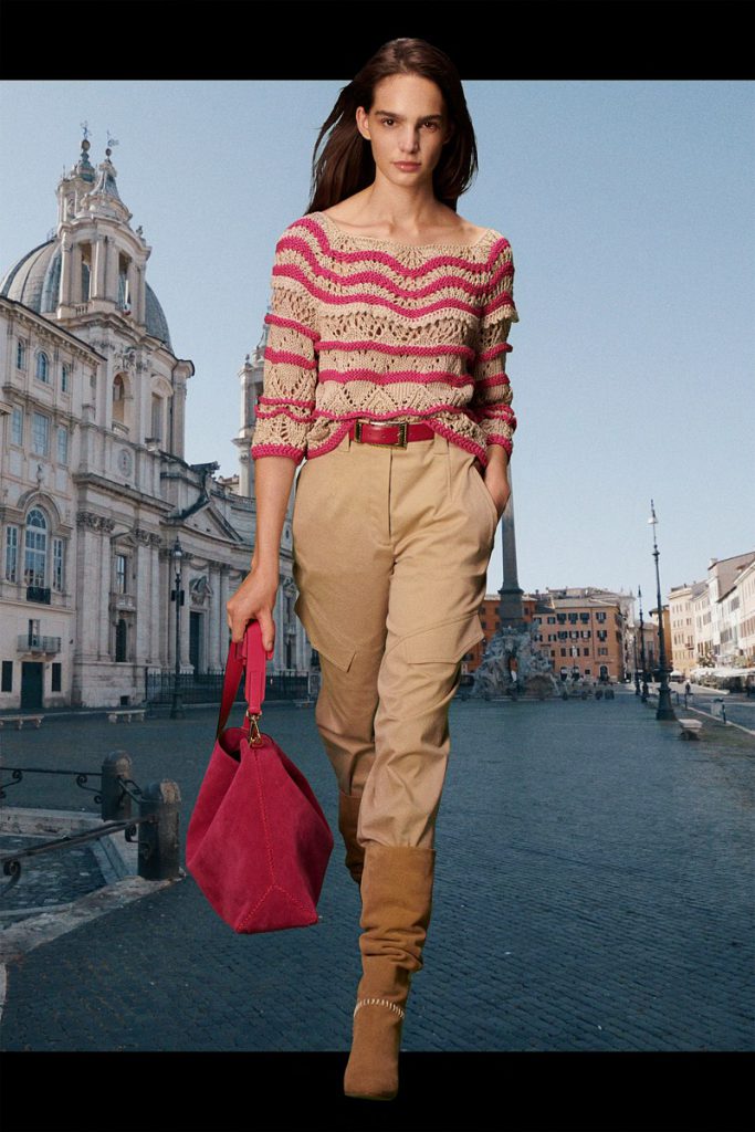 La diseñadora italiana creó una colección de espíritu optimista, con prendas de día y para uso cotidiano. El ADN clásico de la etiqueta se impregna de la energía del naranja, el azul y el rosa, en blusas de satén, vestidos de gasa, pantalones y trajes. Y de noche, vestidos largos y abrigos con flecos de rafia de seda, a puro glamour.