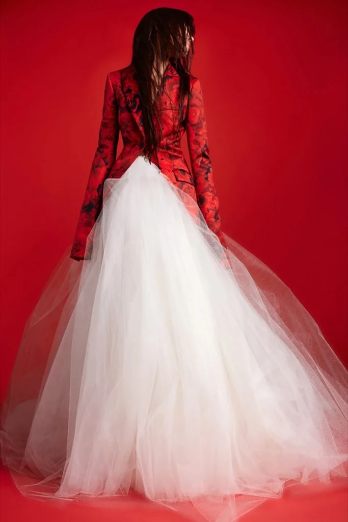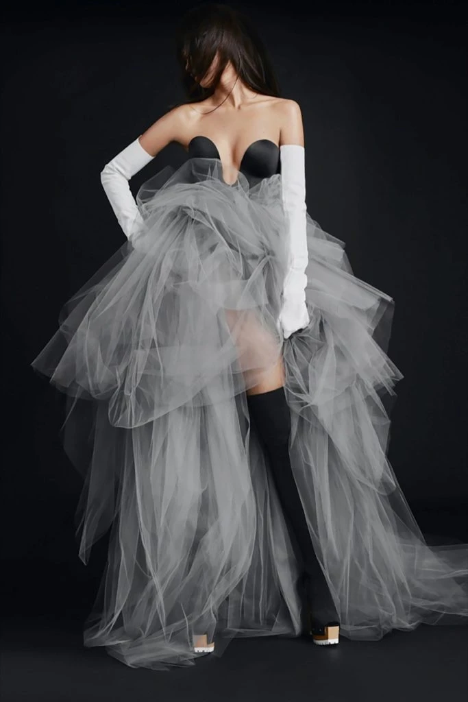 La sastrería juega un papel fundamental en esta propuesta y se combina con grandes faldas de tul con ruedo irregulares logrando siluetas sensuales y modernas.