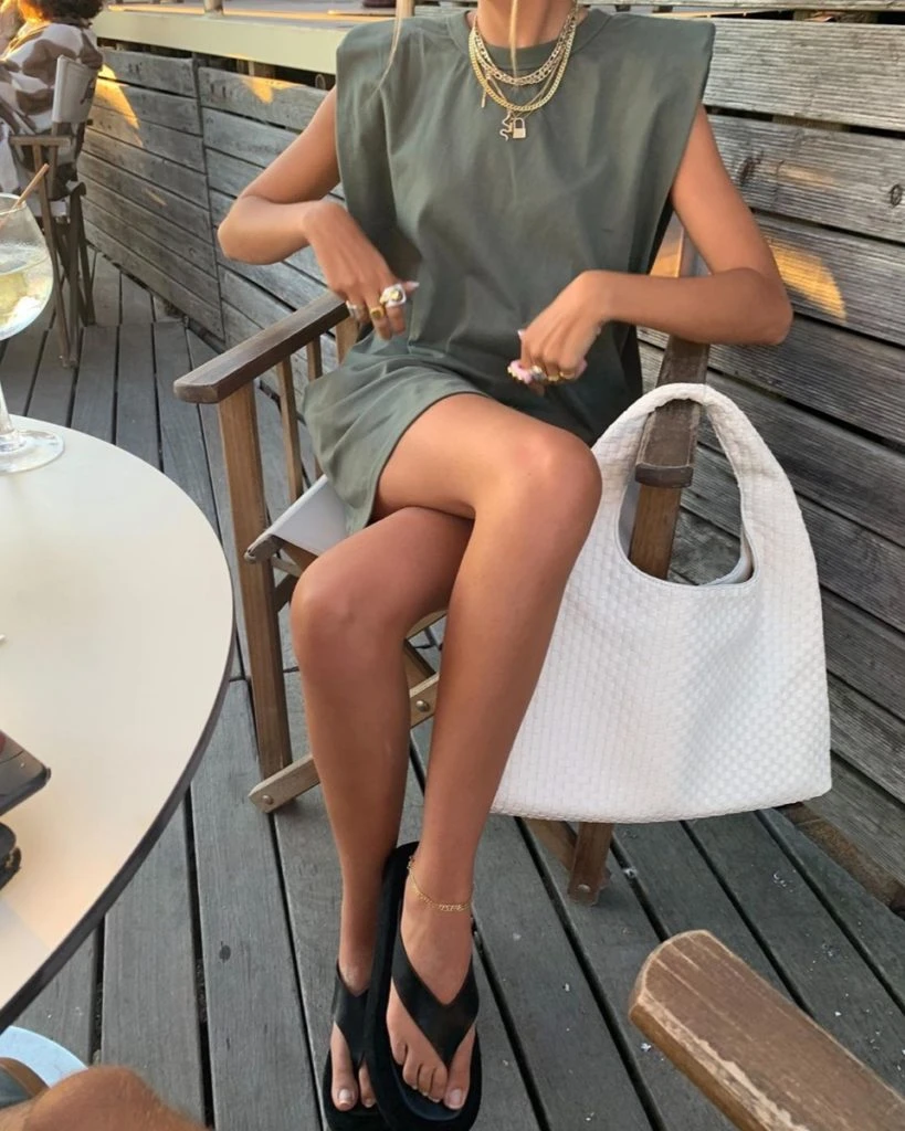 Cómodo, fresco y muy canchero, el vestido de algodón se aggiorna con hombreras para darle el toque más chic.