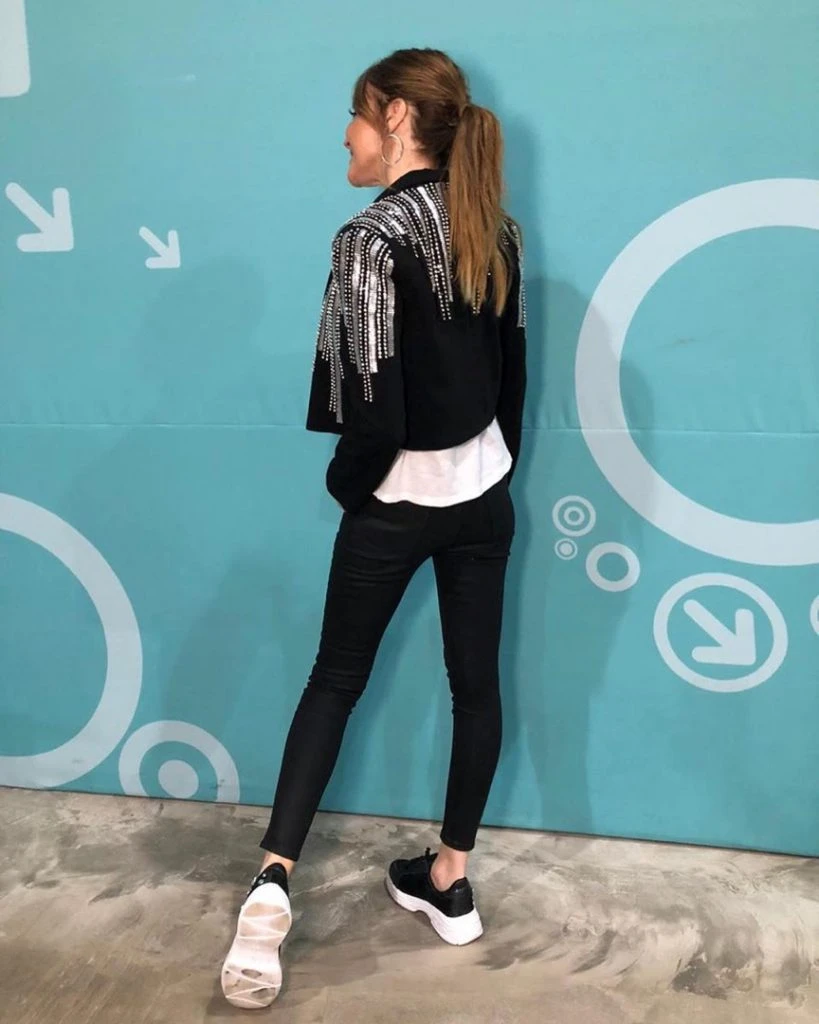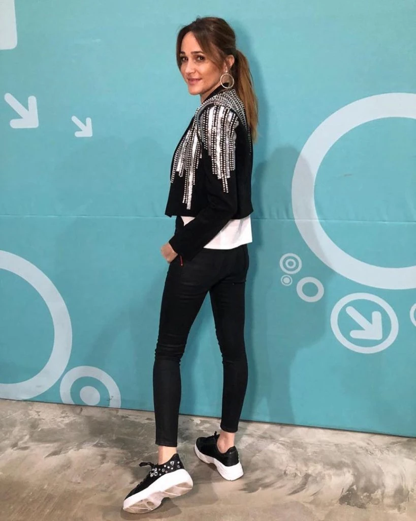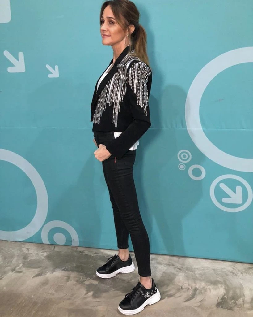 Para uno de los programas de la semana, Vero Lozano eligió este look de Ginebra. La chaqueta en una versión rockera, llevó los detalles plateados que simulaban ser flecos. Otra vez el saco joya.