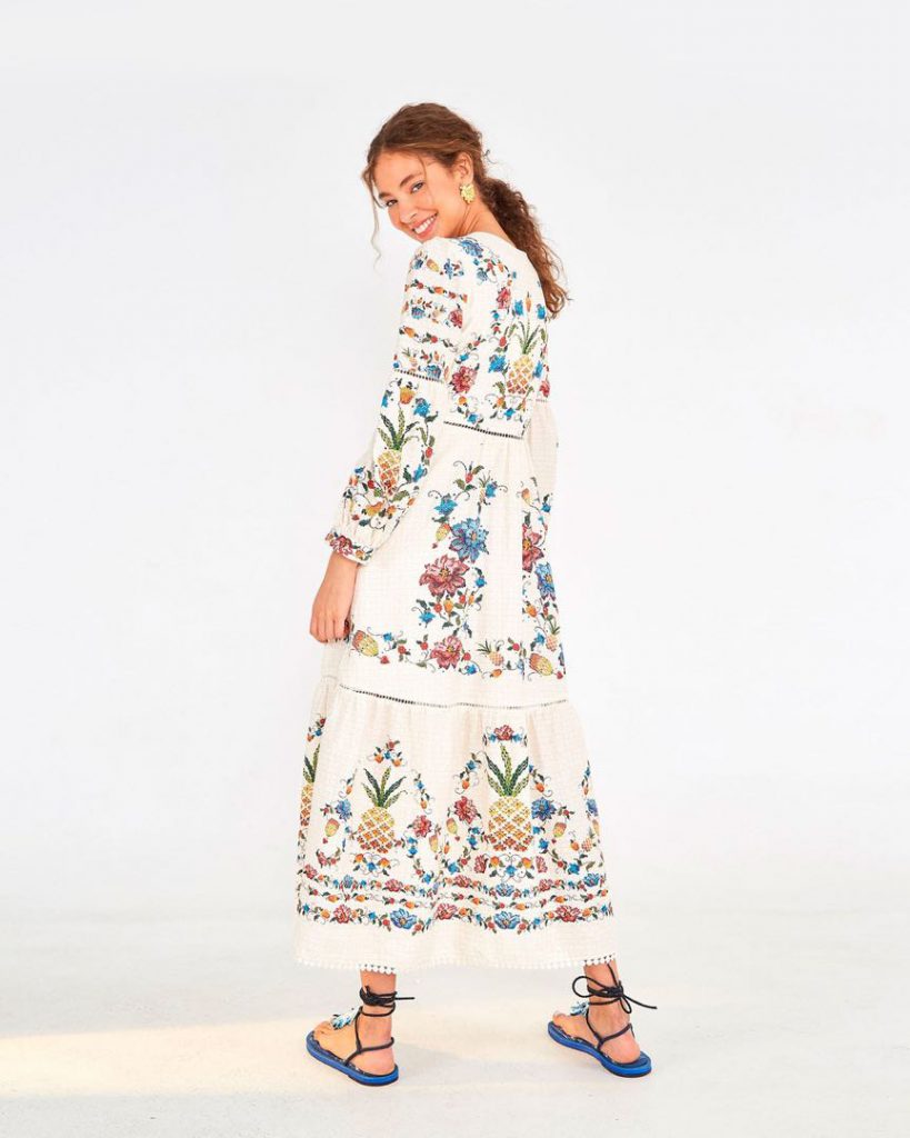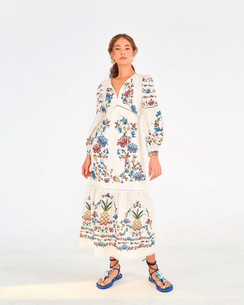 Se trata de un vestido de la colección de Farm Rio, una marca brasilera que se dedica a hacer diseños bordados. Sale 209 euros.