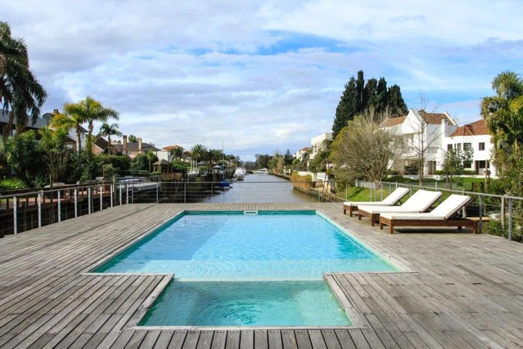 La arquitectura moderna, la pileta y el rio son protagonistas de esta propuesta. Una vivienda diseñada de cara a un canal y ambientada con un estilo atemporal cargado de personalidad.