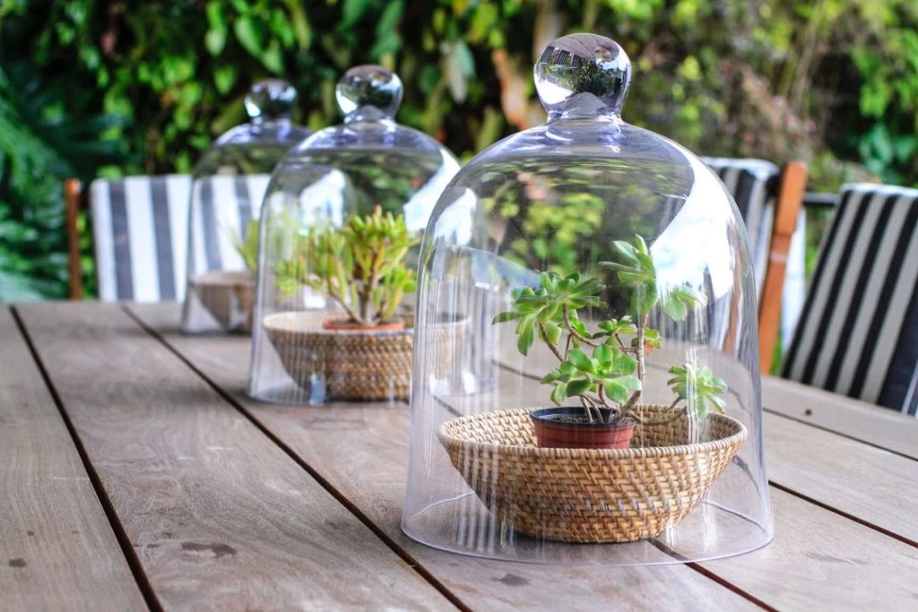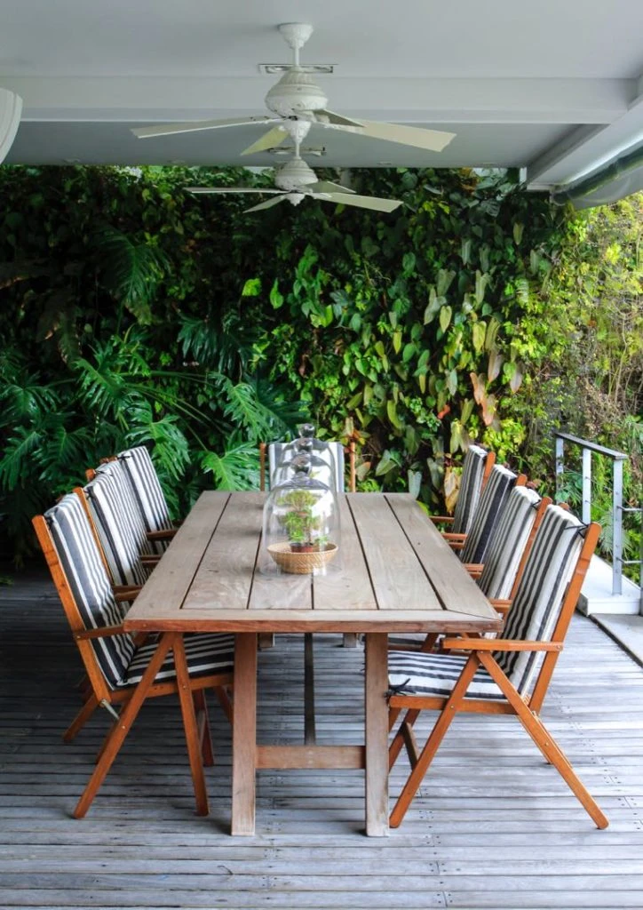 Junto a la parrilla se armó un comedor de exteriores con una mesa de lapacho acompañada por sillas plegables de madera con tela rayada. Como original centro de mesa, un grupo de crasas tapadas por campanas de vidrio. Atrás, un jardín vertical que combina orejas de elefante, costillas de Adán, potus y enredaderas crea un original telón verde.