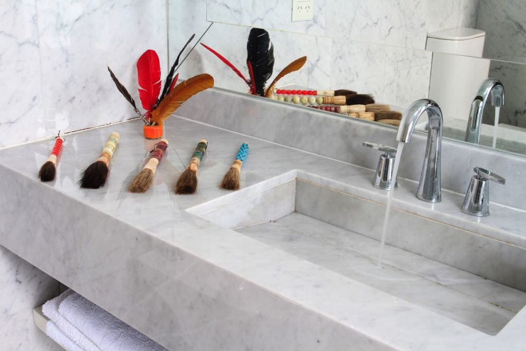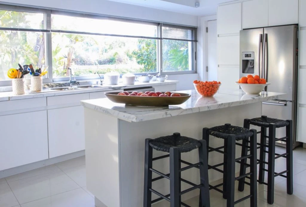 La cocina es bien contemporánea y mira al frente. Tiene una isla con desayunador que se ubica en el centro del espacio, acompañada por unos bancos altos de madera y mimbre del Tigre. Todos los muebles son de madera laqueada de blanco, con mesada de mármol bien net y cortinas americanas (dillenberger.com).