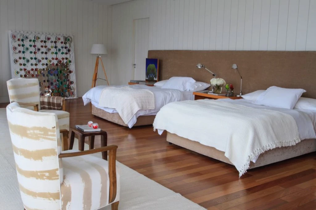 La suite tiene pisos entablonados (www.patagoniaflooring.com) y paredes revestidas en siding. Un gran respaldo tapizado en pana abraza a las dos camas queen y sus mesas de luz. El gran cuadro con espejos de Cecilia Glazman y el famoso ombú pintado por Nicolás García Uriburu, dan la nota de arte. Sobre una alfombra de lana cruda (Manos del Uruguay) sillones de lectura (Casa Didot).