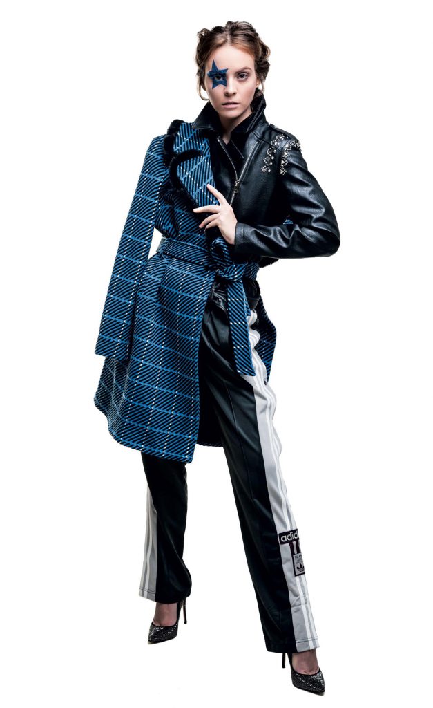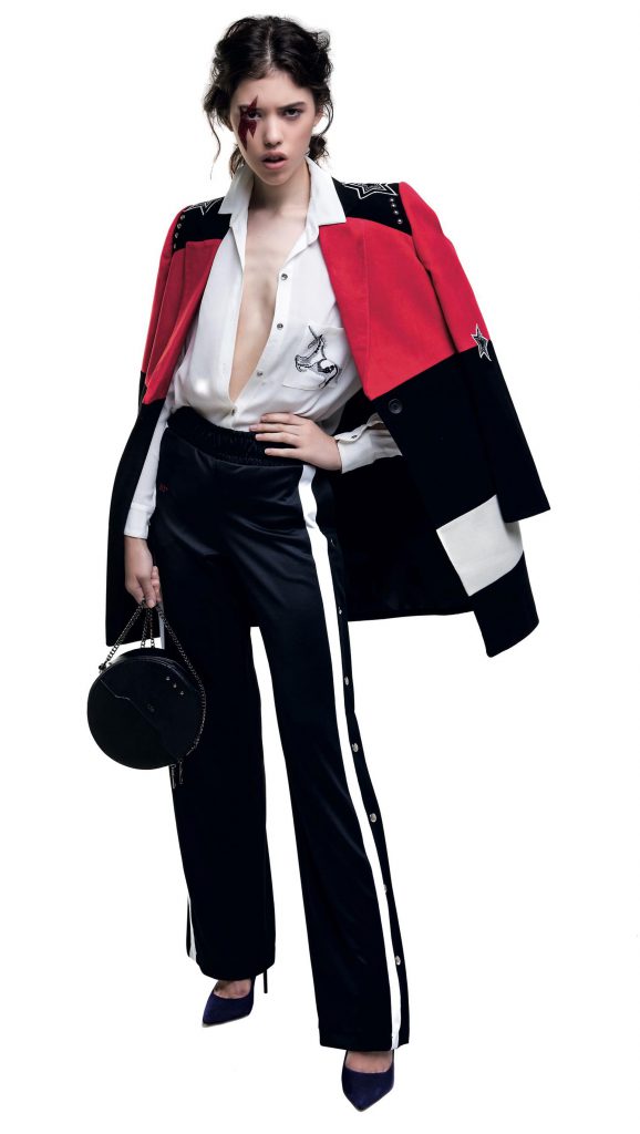 Saco y pantalón animal print de velvet ($ 5.900 y $ 4.200, Uma), camisa de seda con lazo ($ 2.640, Mishka) y zapatillas con plataforma corrida ($ 2.999, adidas).