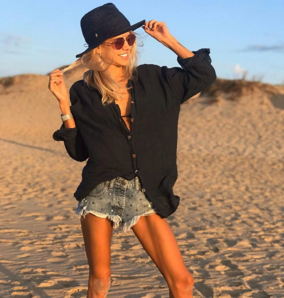 La modelo se lookeó con camisa negra sobre la bikini, short de jean desflecado y con aplicaciones de tachas, sombrero negro y lentes oscuros de sol.