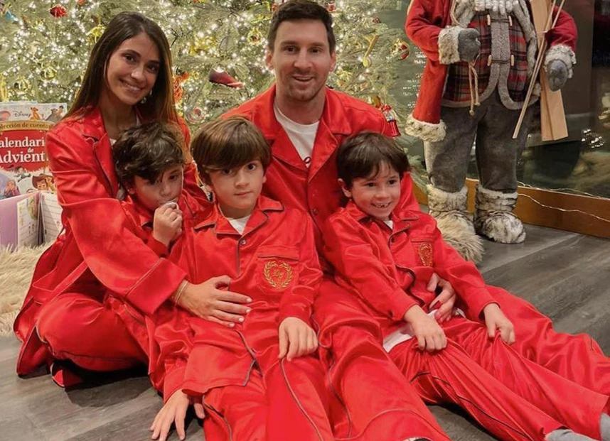 Antonela Roccuzzo compartió en sus redes sociales la tradicional postal navideña que todos los años realiza junto a su familia. Esta vez, los Messi -Lionel, Antonela, Thiago, Mateo y Ciro-, aparecen vestidos con pijamas rojos Dolce & Gabbana, sentados a los pies de un hermoso árbol de Navidad y al lado de una figura de Papá Noel.