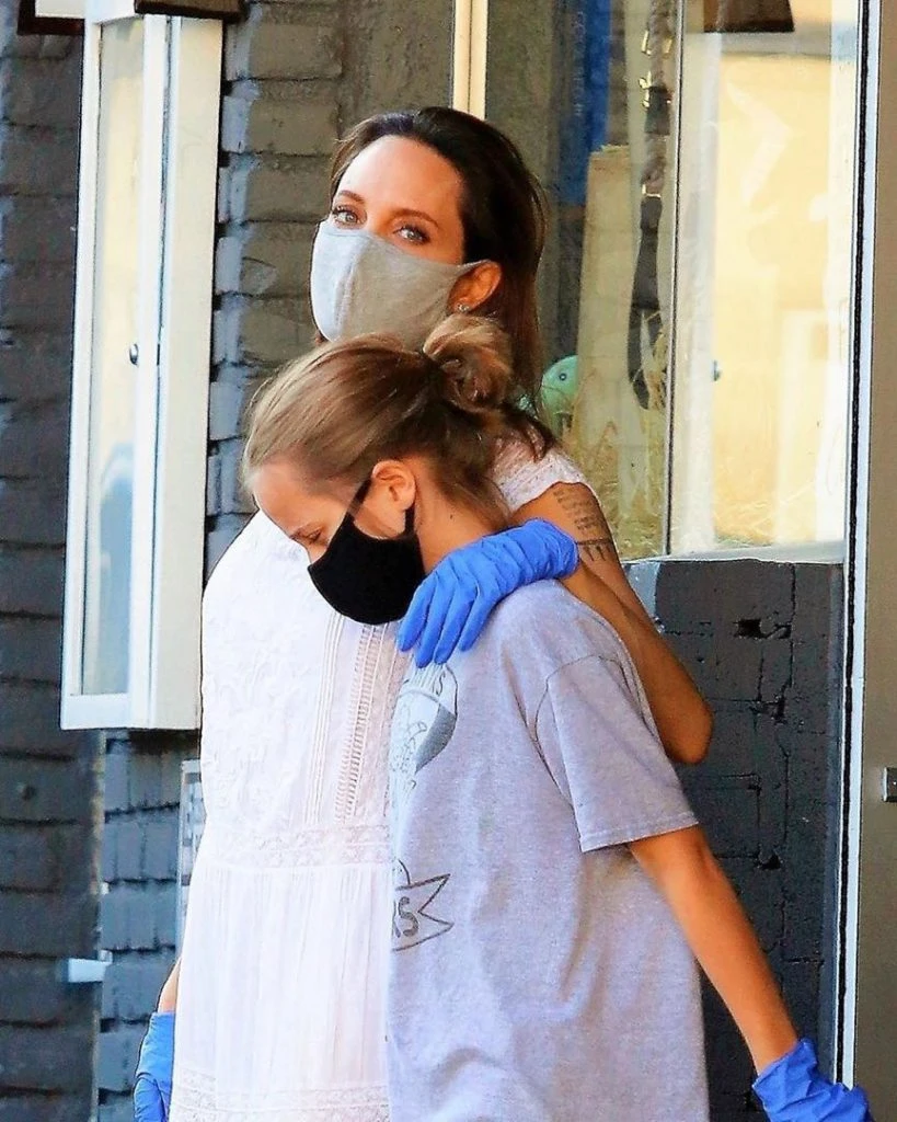En las dos ocasiones, tanto Angelina como Vivienne llevaron llevaron tapabocas de tela de color gris.