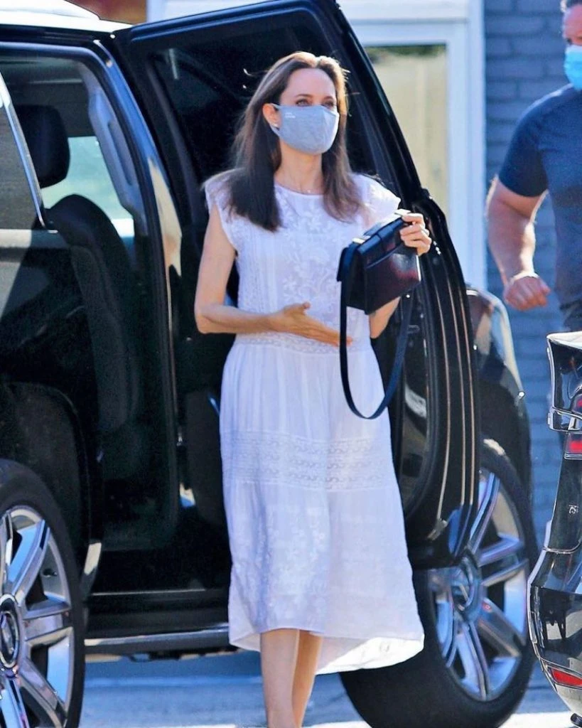 Primero apareció con un vestido blanco tipo boho chic, de largo midi y suelto. El vestido llevaba mangas cortas y bordados. Angelina completó el look con chatitas nude de Chloé y cartera negra de Dior.