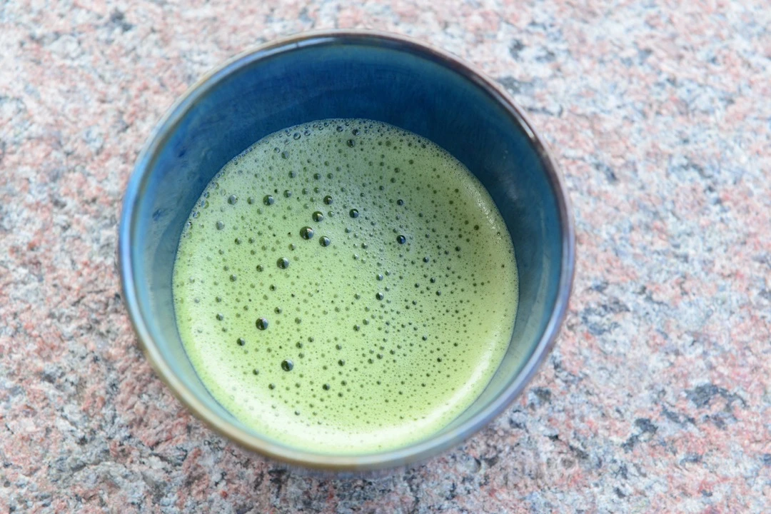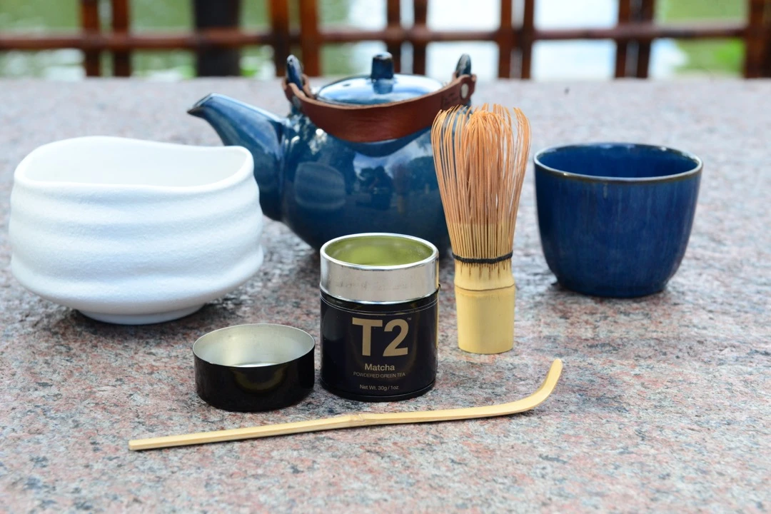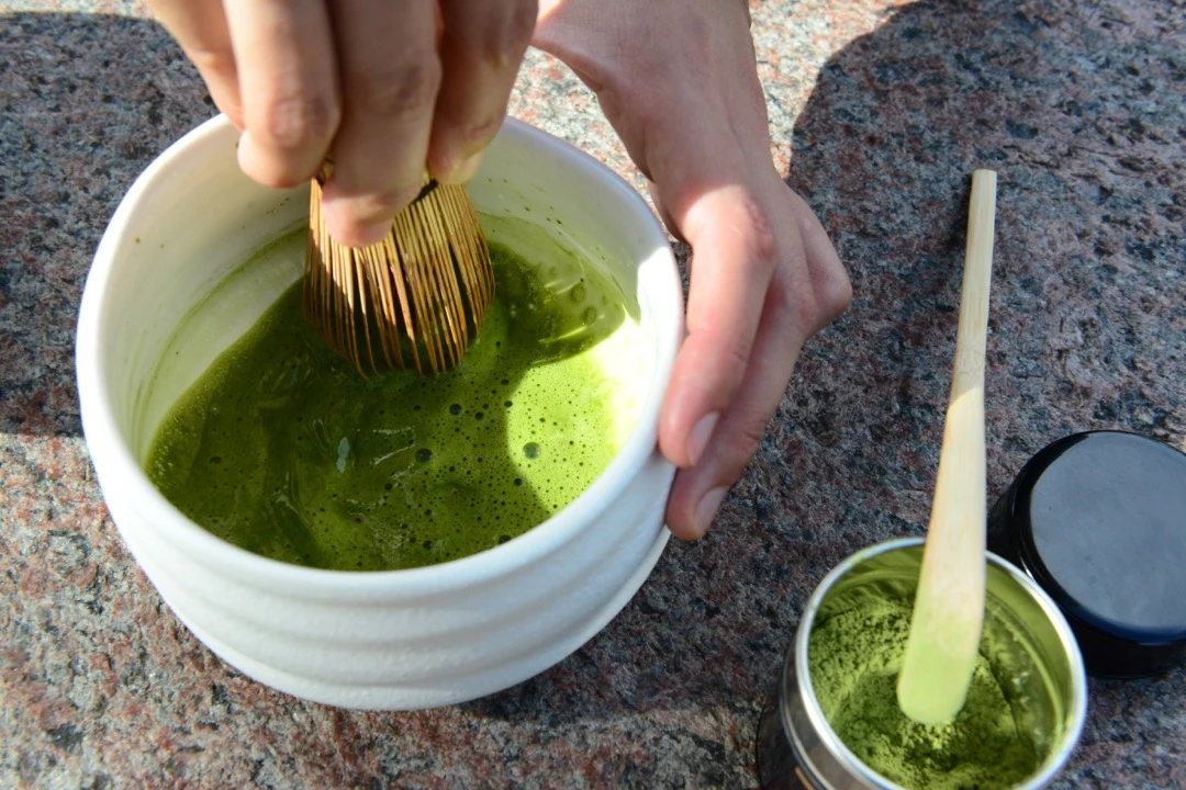 Mise en place: prepará todos los utensilios que vas a usar. Un bowl pequeño o cuenco de cerámica llamado chawan, un batidor de bambú llamado chasen, una cucharadita de bambú llamada chashaku, una pava con agua caliente (70-80º) y el té matcha en polvo.