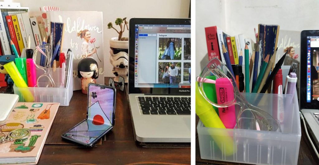Contra la pared (con algún enchufe cerca o un cargador portátil), a mano de la luz natural pero tampoco demasiado a mano: me distrae. Tener un lapicero guarda-todo es salvador. Saqué todas las biromes y marcadores que ya no servían, son una pérdida de tiempo (y espacio) y dejé mis amados lápices negros, con la punta bien filosa.
