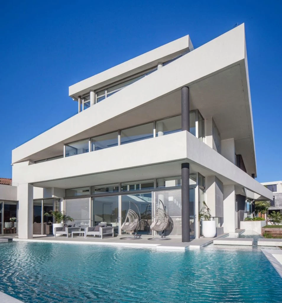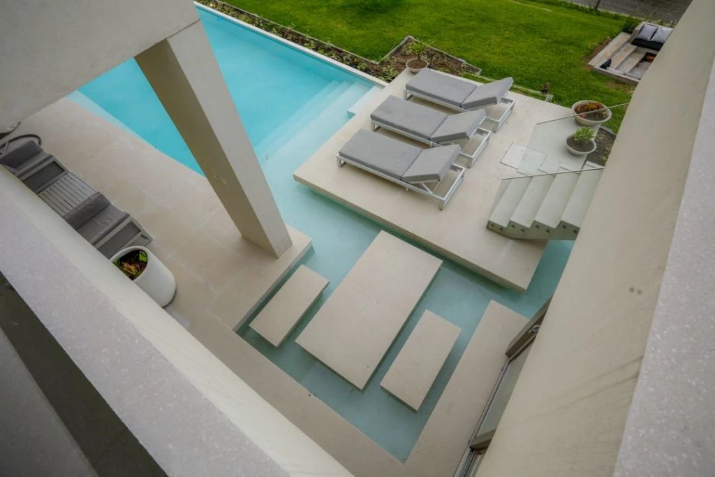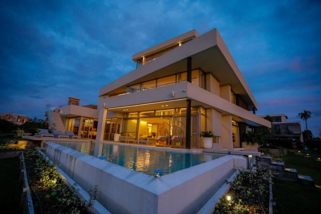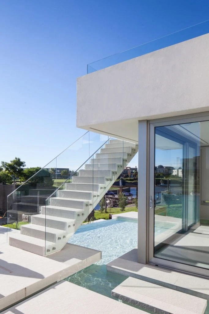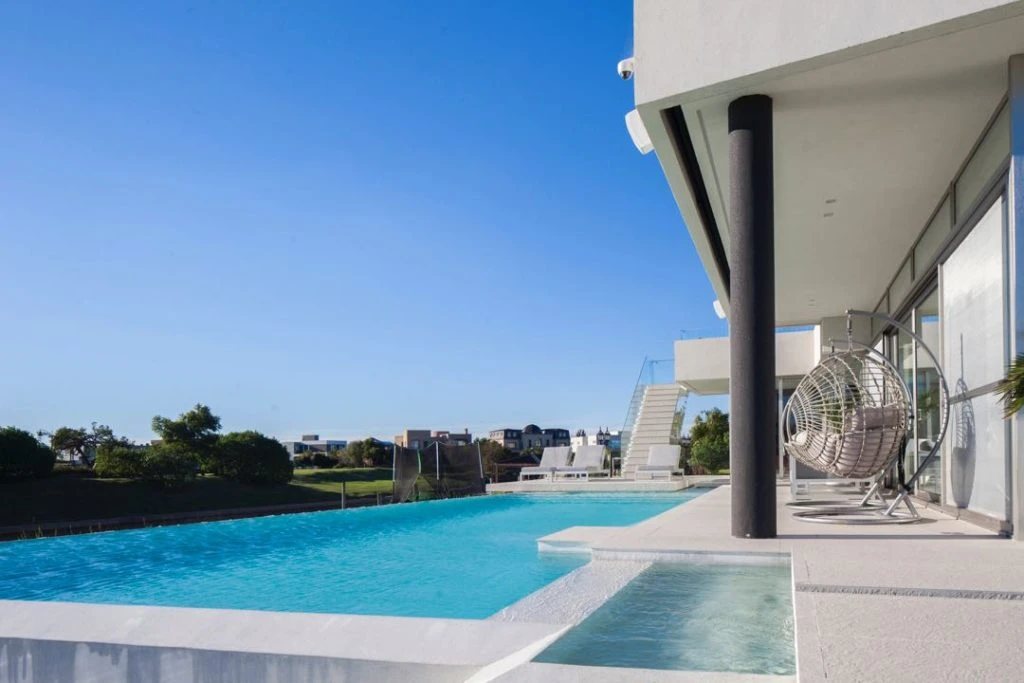 Con un estilo neto y geométrico, el agua es otro elemento clave de la casa. Tiene una pileta envolvente con solarium al que se puede acceder directamente desde la escalera del exterior.