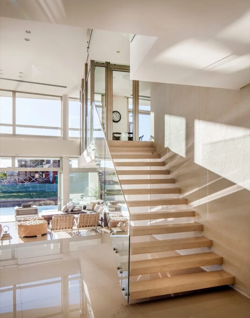 Las fachadas de la casa tienen importantes superficies vidriadas del piso al techo. Esto permite obtener vistas profundas y ángulos con una perspectiva de 180 grados. De esta manera, se se logra potenciar el efecto de inmensidad territorial circundante.