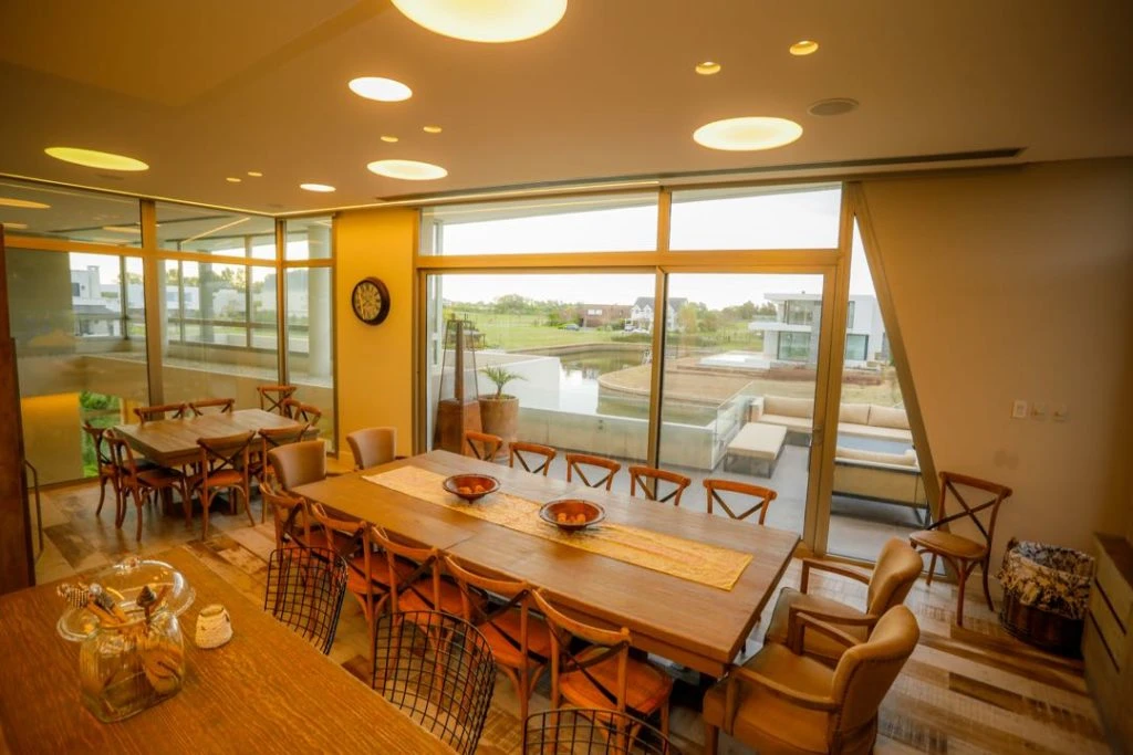 También posee dos muelles para embarcaciones y uno con deck para deportes acuáticos. Para potenciar el disfrute del entorno se armó un rincón de fuego para reuniones sociales al aire libre.