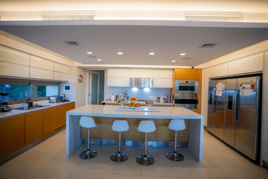 En el primer piso se disponen cuatro suites, un salón social y un espacio de eventos -“roofed barbecue”- con acceso directo desde la zona pública. Y en el tercer nivel se encuentra la suite principal, con baño tricompartimentado y dos vestidores independientes.