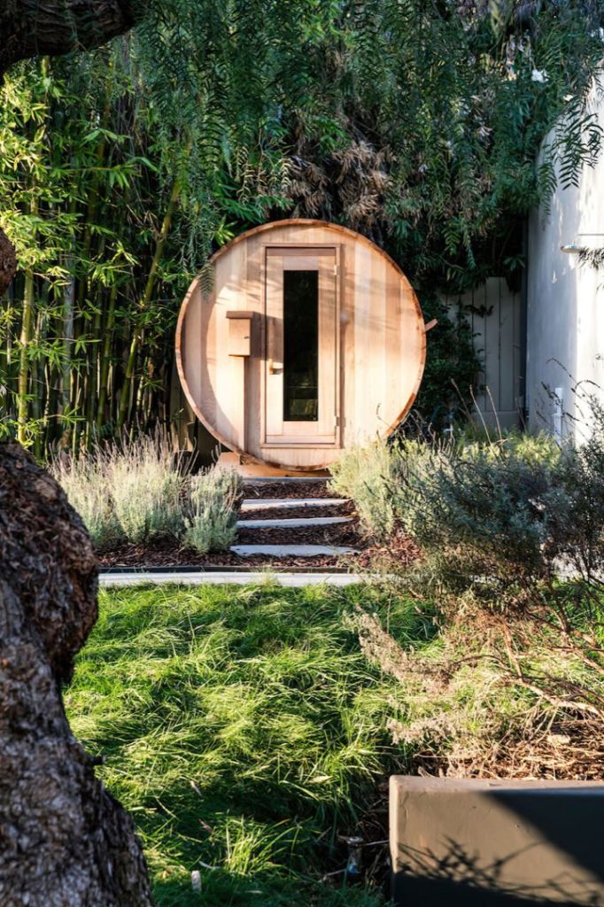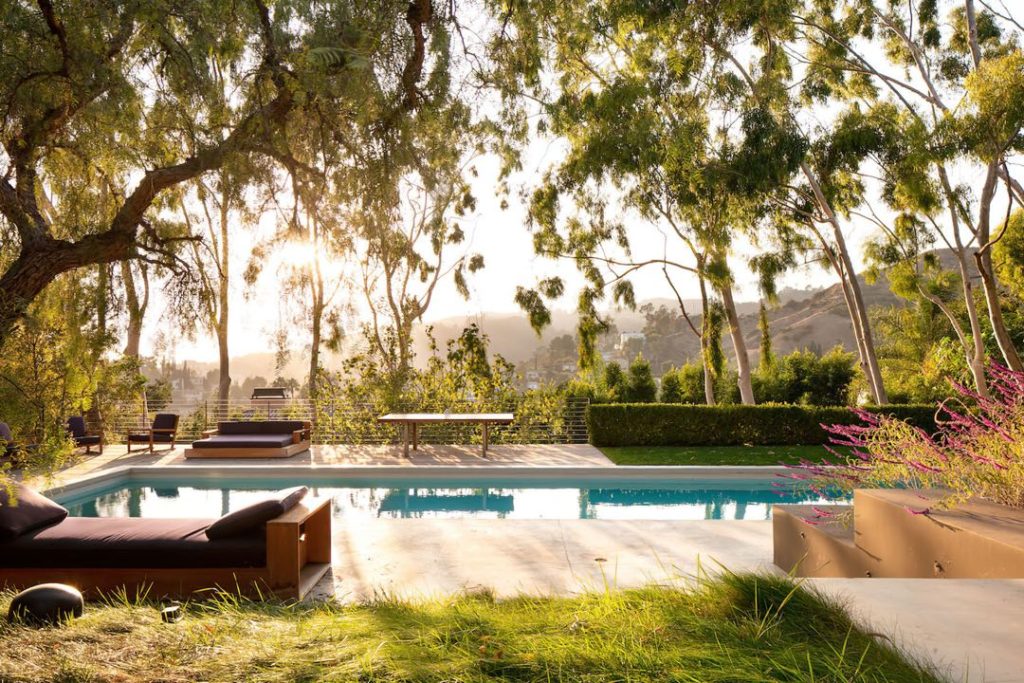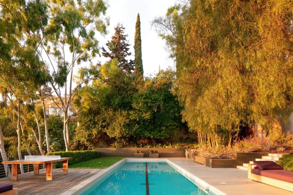 En el exterior de la casa de Ashley Tisdale, hay una piscina olímpica de agua salada, más una terraza con fogonero, un cuarto de sauna en forma de barril, y mucho verde alrededor.