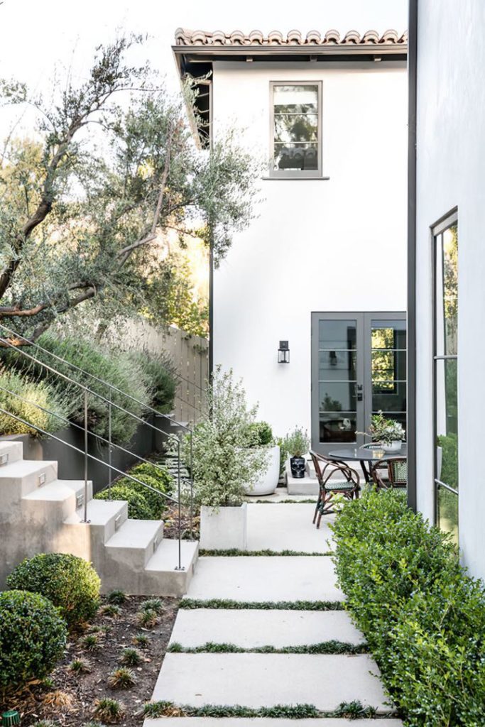 Un exterior de estuco blanco presenta un techo de terracota rojo, rodeado de un exuberante paisaje verde y una pasarela de cemento.