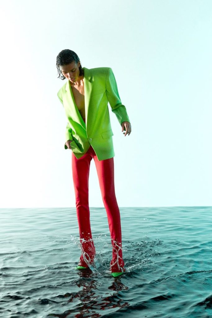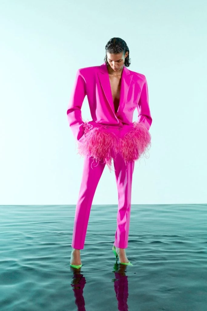 Ahora acaban de presentar su nueva colección resort 2021. Apostaron a una silueta sinuosa y esbelta. Ultrafemenina como un conjunto de blazer en rosa chicle con hombreras y plumas, y pantalón ajustado haciendo juego.