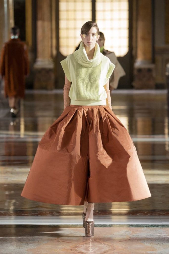 Una colección presentada en la impactante Galería Colonna de Roma, Valentino realizó un desfile sin público presente donde las modelos desfilaron diseños más futuristas de lo que habitualmente vemos.