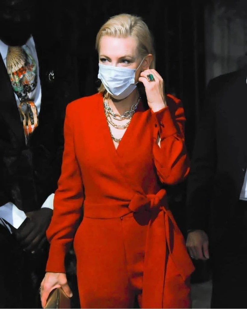 A Cate se la vio seguir a rajatabla lo protocolos de seguridad: barbijos obligatorios en la funciones. Con un look más increíble que el otro (muchos vintage, que serán subastados a beneficio al término del festival) Blanchett solo puso el barbijo a un lado a la hora de posar para las cámaras.