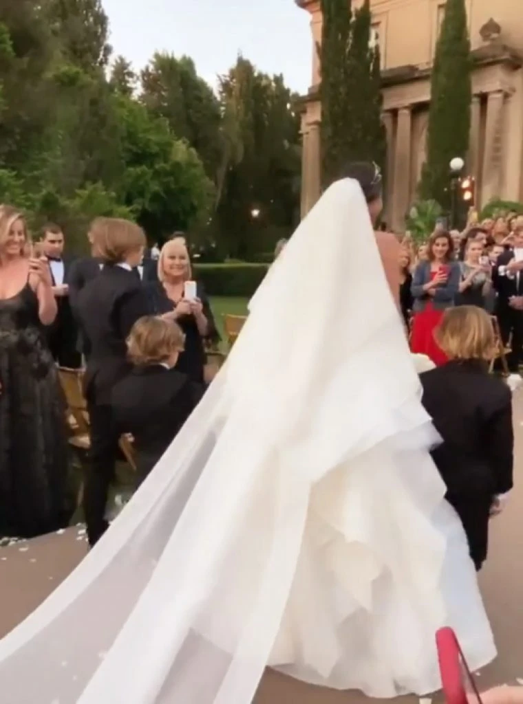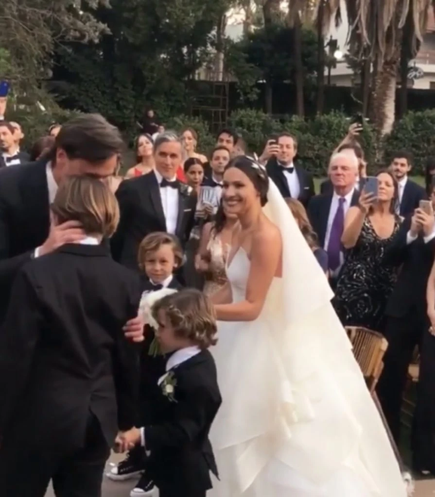 Con la música de Ennio Morricone de Cinema Paradiso y de la mano de sus tres hijos, Pampita Carolina Ardohain caminaba hacia el altar al aire libre en el jardín del Palacio Sans Souci. Un cortejo de nenas de vestidos blancos y coronas de flores, y varones vestidos con smoking le arrojaban pétalos de rosas blancas.