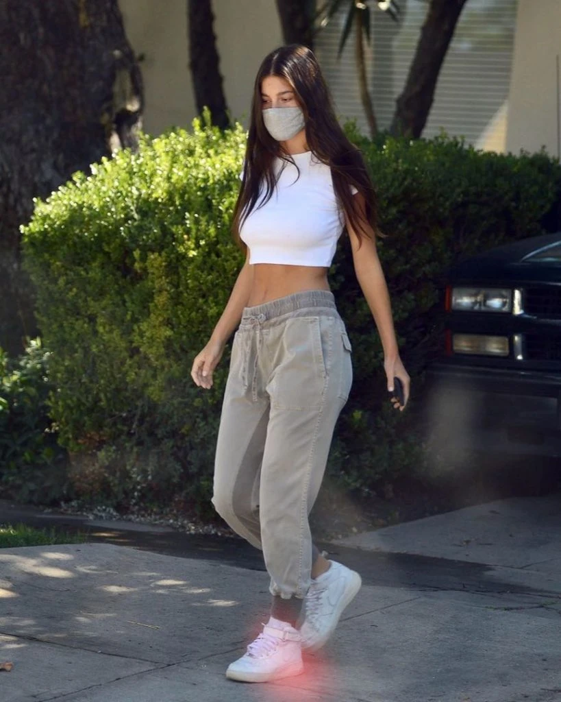 La actriz y modelo eligió un crop top blanco, un pantalón jogger, zapatillas tipo botita en blanco y barbijo gris.