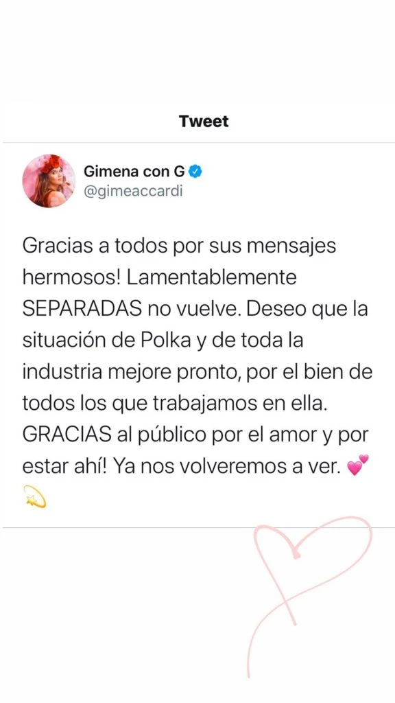 "SOMOS MUCHOS los que hicimos @separadas, somos muchos los que hoy nos despedimos de manera virtual con un nudo en la panza. Estamos viviendo un momento histórico, y deseo de corazón para nuestra industria como para tantas otras, una solución sana y equitativa para los trabajadores y sus familias. Los voy a extrañar. Polka ??", concluyó.