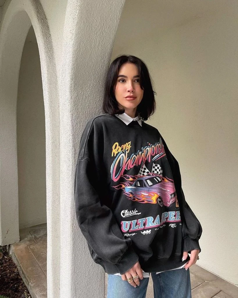El buzo oversize de estampa retro se sumó al jean y a la camisa blanca, para un look casual y descontracturado.