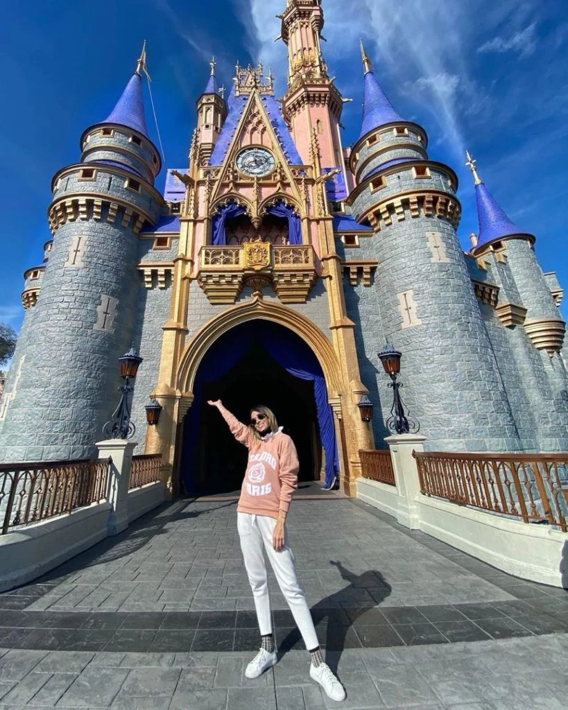 La fashionista Geraldine Mayer sumó un buzo coral claro con estampa en blanco a un jogger, con medias a cuadrillé y zapatillas.