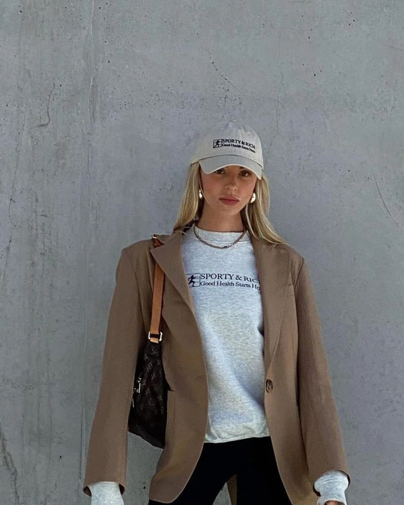 Este look suma prendas deportivas (el buzo y la gorra trucker) y otras más formales, como el blazer y el pantalón negro. Lo que en otro momento no hubiéramos combinado, hoy integra un outfit estudiantil bien canchero.