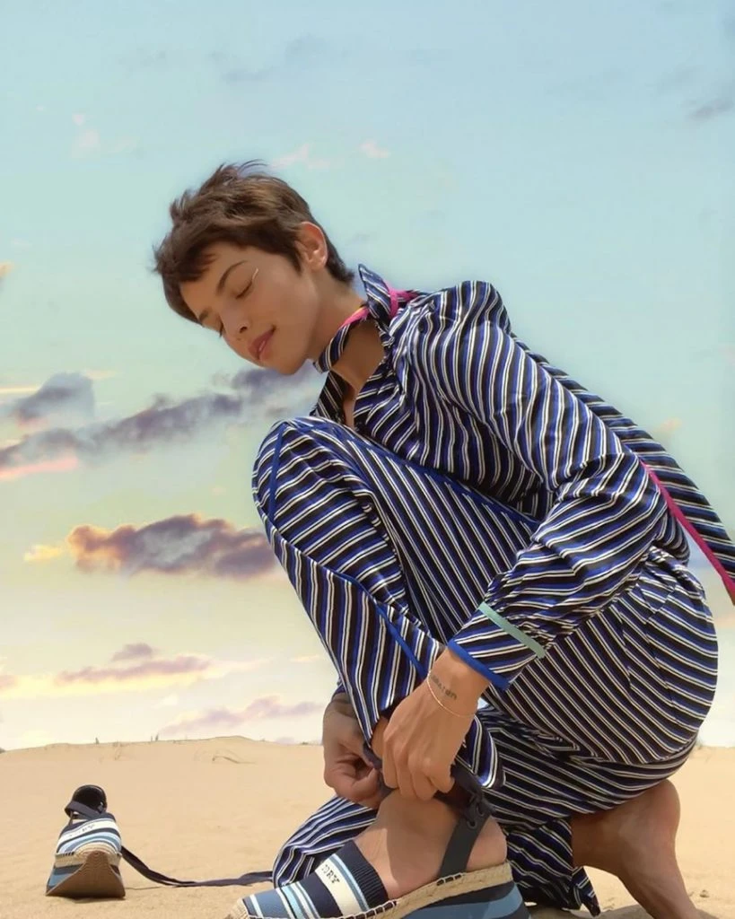 Recientemente fue muy llamativo el look que eligió para ir a la playa. Se vistió con un mono de la diseñadora inglesa Tory Burch. Rayado en azul y blanco con vivos en fucsia y naranja en el lazo de la cintura, este outfit es súper canchero y muy trendy pero más apto para una fiesta al atardecer que para usar desde temprano para ir a al playa.