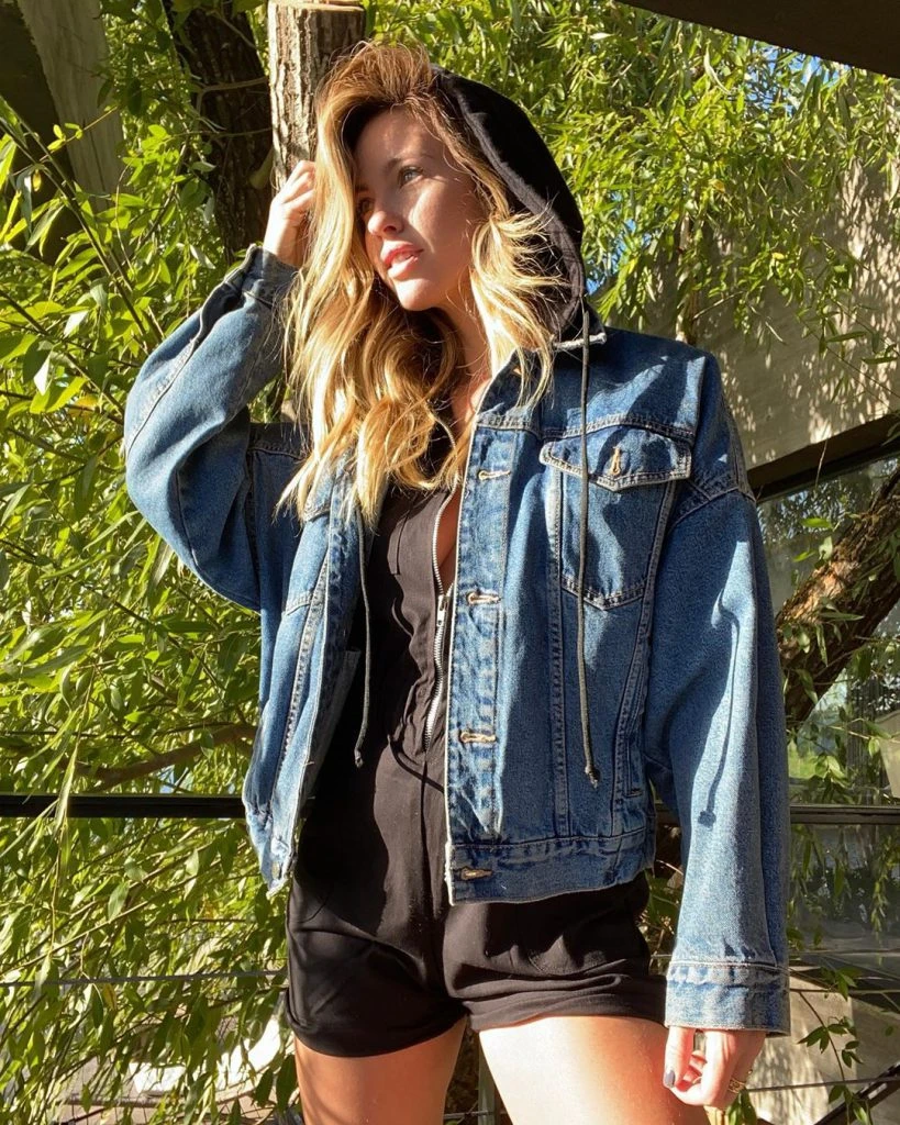 Ella eligió un mono corto en color negro, con capucha y cierre en la parte del escote. Y lo combinó con campera de jean. Vos, ¿te producís para ir a hacer las compras?