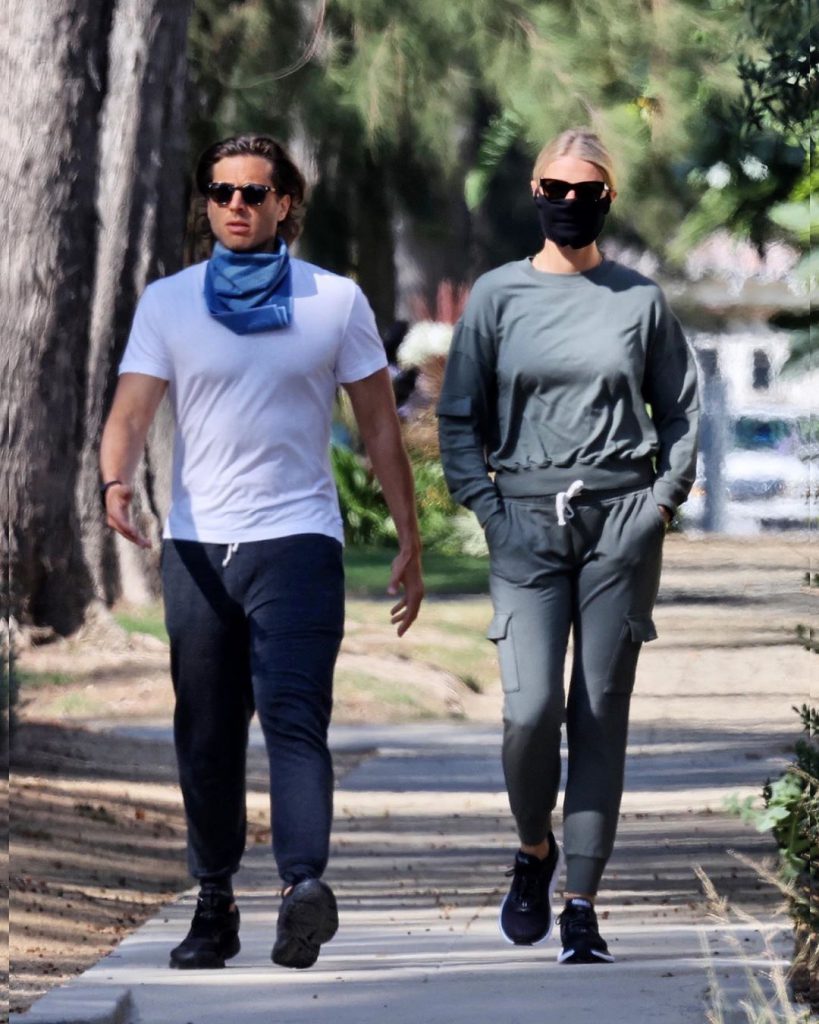 Gwyneth Paltrow salió a caminar y a tomar aire por las calles de Los Ángeles con su marido Brad Falchuk, y a su look deportivo le sumó un barbijo negro.