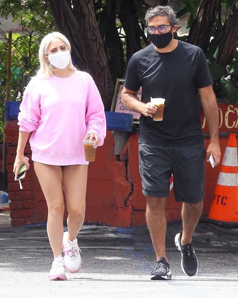 Sin tacos, brillos ni atuendo estrafalario. Lady Gaga está más relajada que nunca y sale a la calle con lo primero que encuentra en el placard. Zapatillas y buzo en color rosa, con un simple barbijo blanco (creemos que debajo del suéter lleva un short o un traje de baño) es el outfit que eligió para salir a tomar un café con su novio Michael Polansky.