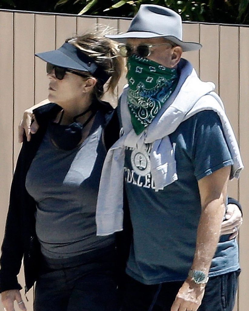 Rita Wilson y Tom Hanks ya contrajeron coronavirus. Sin embargo, el actor sale protegido con un pañuelo estilo cowboy súper canchero. Su mujer, en cambio, lleva el barbijo colgando en el cuello.
