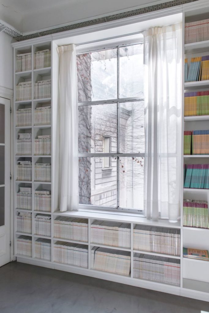 En el pasillo de acceso a las oficinas de directorio se desarrolló una gran biblioteca en laca blanca hasta el techo, con estantes regulables. Para cerrar esa ala de oficinas principales se ideó un cerramiento sutil pero con la impronta de una obra de arte contemporáneo.