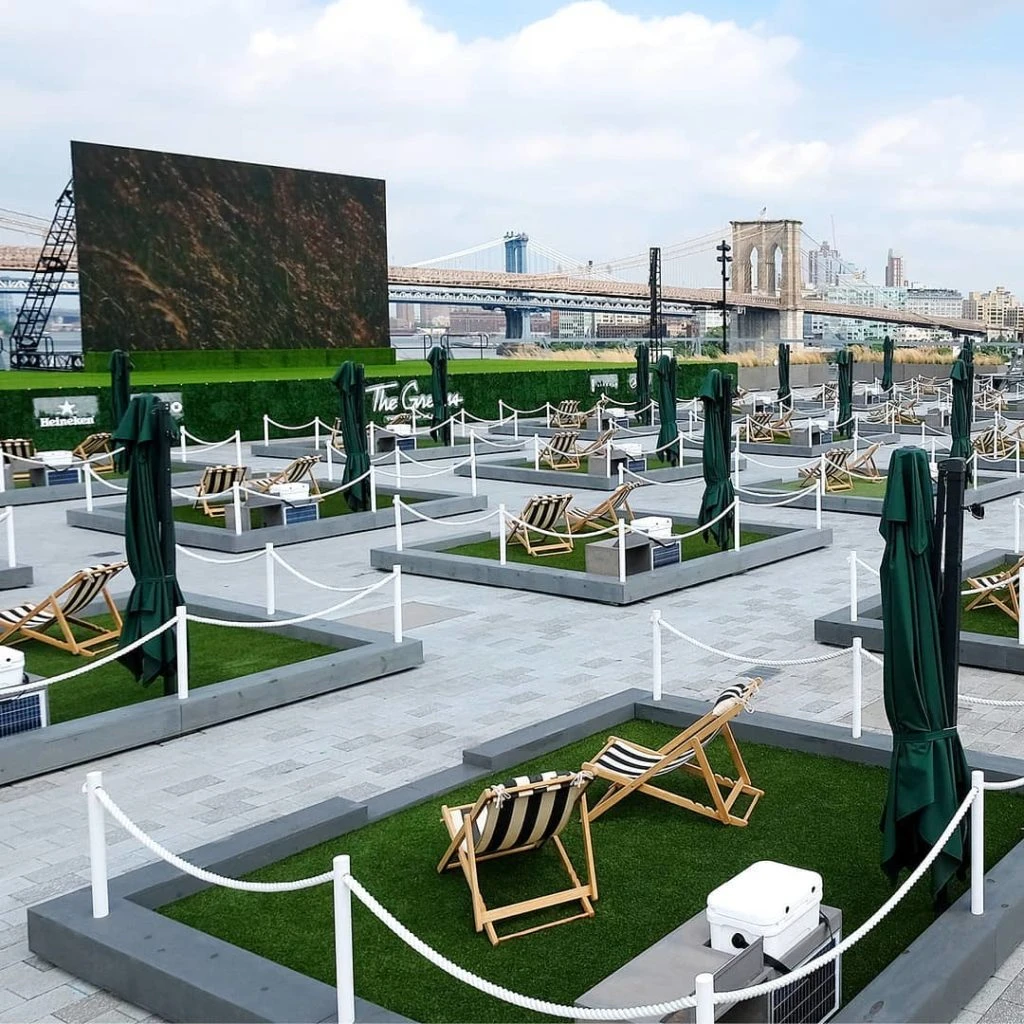 Cada espacio mide 4 x 4 m. Incluye tu sombrilla, tu propia heladera portátil, un puerto USB, pantalla gigante para ver películas cual autocine (pero en autoterraza) y la chance de juegos (en jenga es furor), cocktails y snacks. Ah! y la posibilidad de albergar a 8 personas (el barbijo queda a tu criterio).