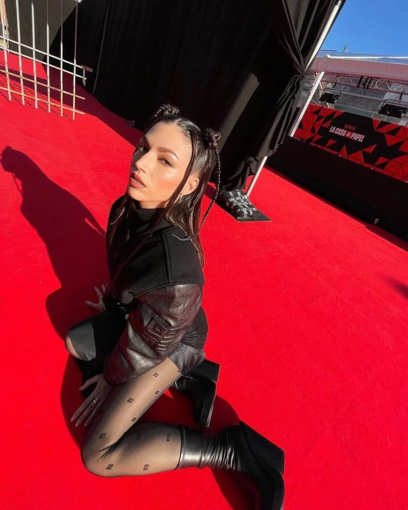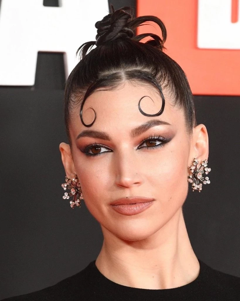 Un rodete en la coronilla, bien prolijo y tirante, ornamentado con figuras hechas con su propio pelo. Esta tendencia se conoce como "baby hair" y es usada por otras estrellas, como Rosalía. En cuanto al make up, se destacó la mirada con un delineado negro que se esfumó en el párpado superior, con sombras de terminación metalizada. Para complementar, los labios nude que es el tono que más se lleva.