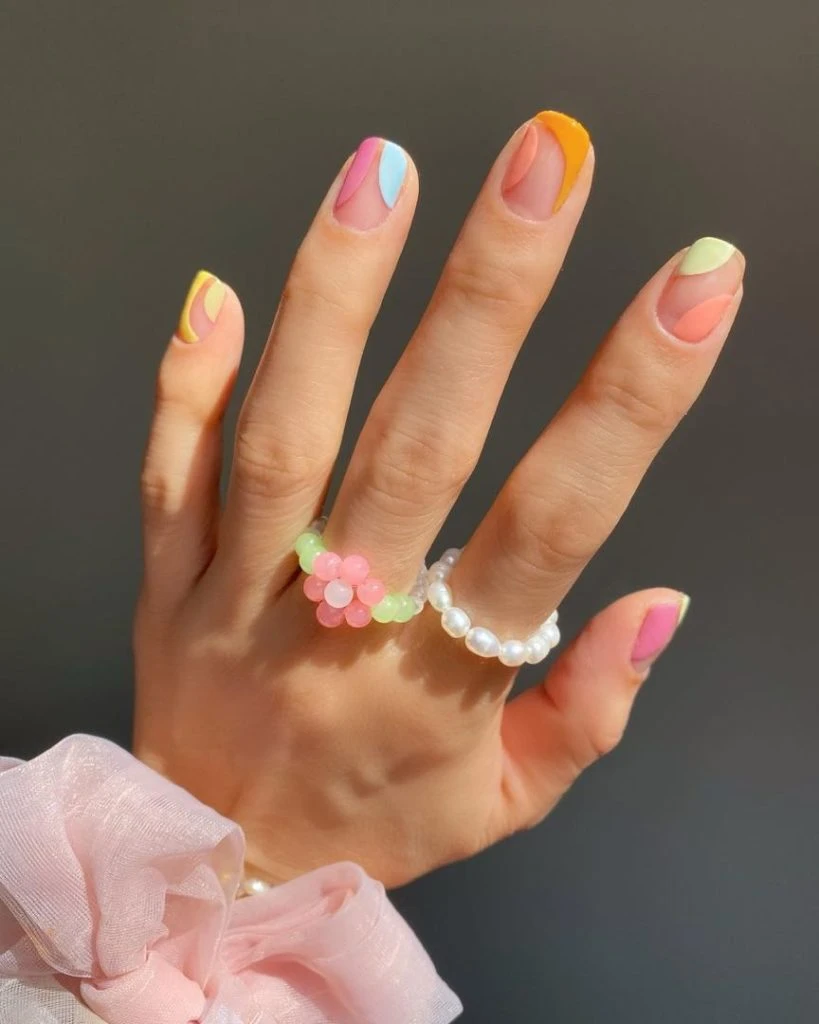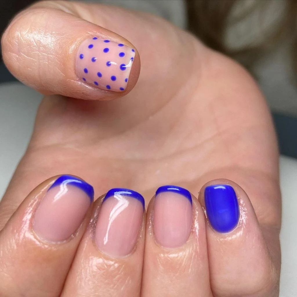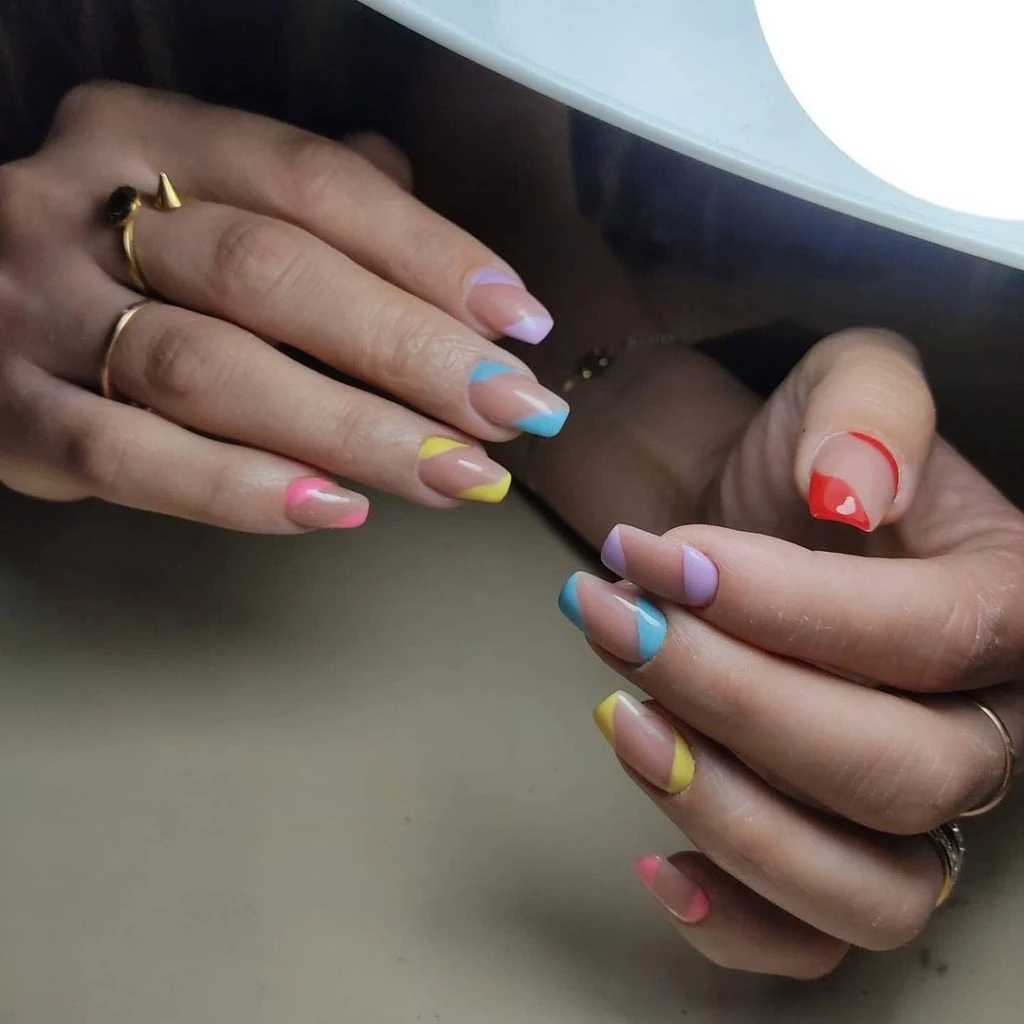 En este caso, podés optar por hacer todos los diseños con un mismo tono, intercalando puntos con uñas totalmente cubiertas, más algunas con francesita. La otra opción se logra pegando una cinta en el centro de la uña y cubriendo el resto con esmaltes de diferentes colores.