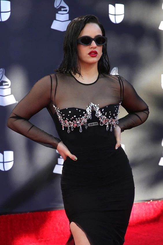 Rosalía también llevó este look en los Grammy 2022 con el pelo suelto y la raya de costado, completamente bañado en gel.