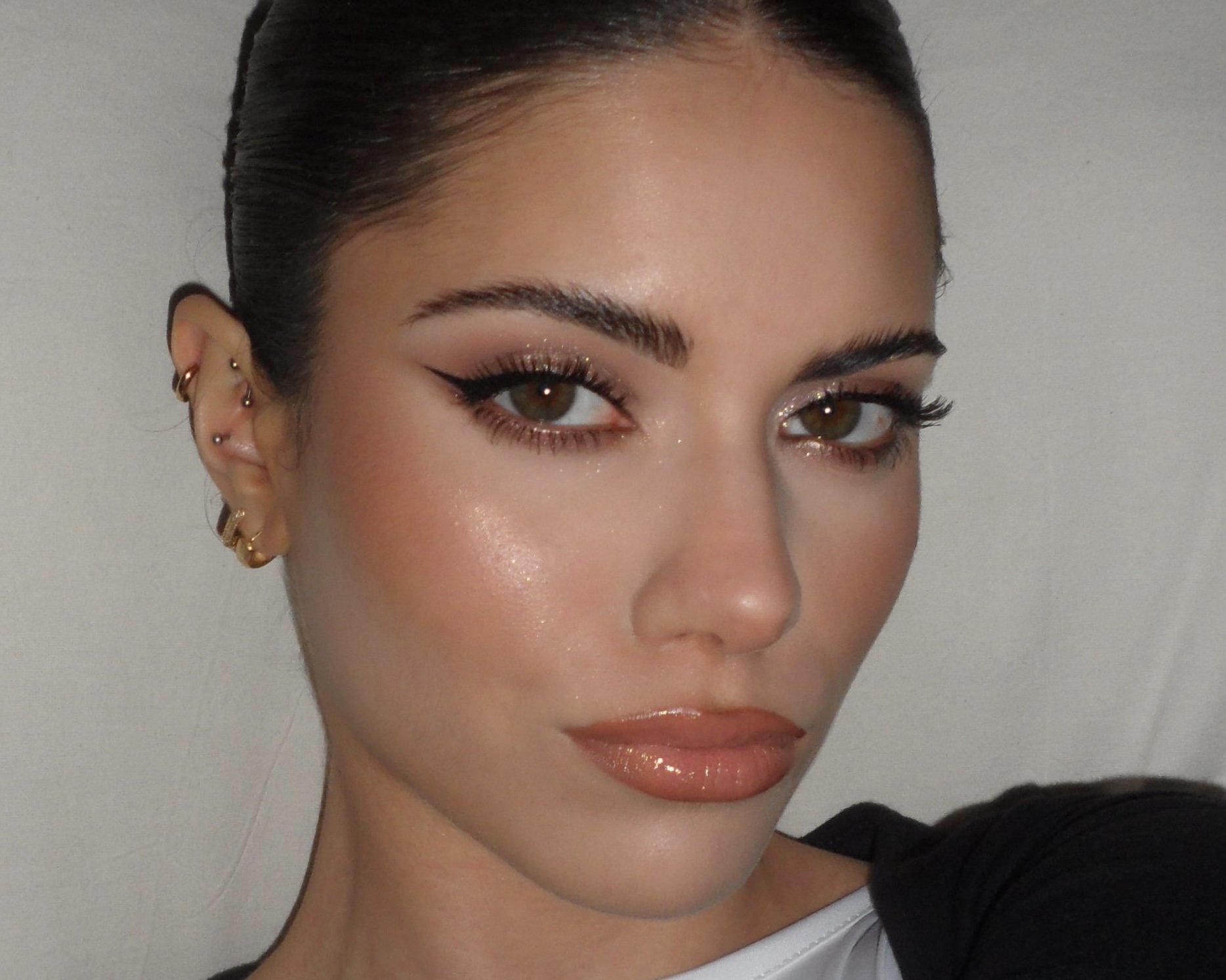 Destacá los ojos con sombras brillosas y tonos neutros. Los tonos más oscuros, mantenerlos cerca la línea de pestañas y acompañalos con un delineado con colita, para rasgar bien el ojo.