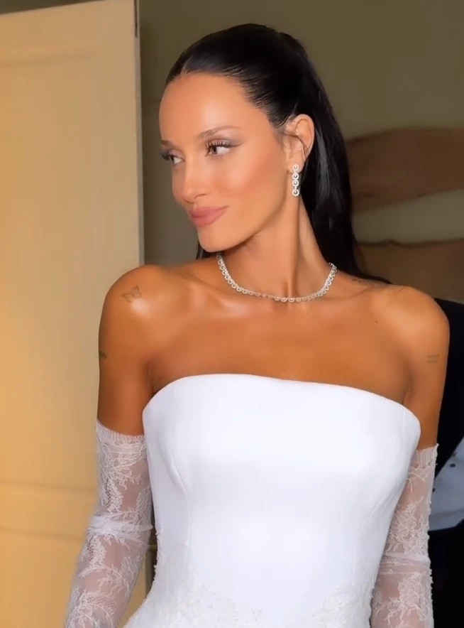 Otro detalle que no pasó desapercibido fue el imponente velo por el que optó Sabatini. La ahora esposa de Paulo Dybala, complementó su elegante peinado y maquillaje con un velo de novia que añadía un toque de tradición y sofisticación a su look. Este accesorio nupcial, de tul suave y delicado, se extendía desde la una hebilla en su recogido hasta el suelo.