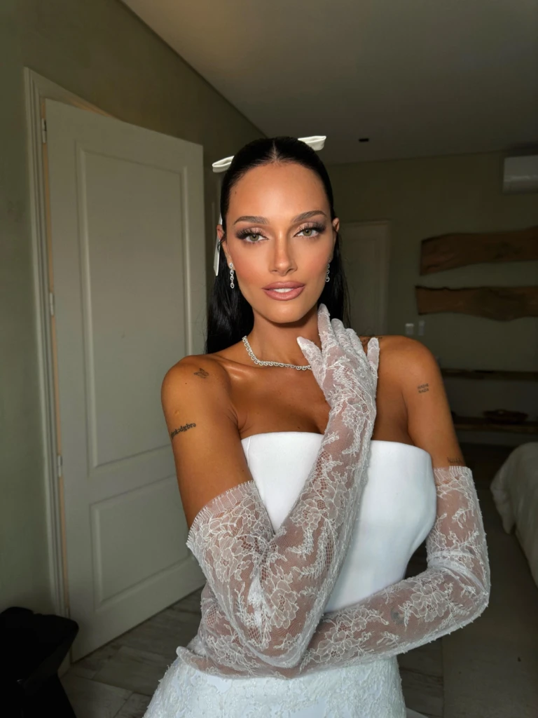 Para su boda, Oriana Sabatini optó por un maquillaje que resaltaba su belleza natural. En manos de la maquilladora Betina Frumboli, logró un equilibrio perfecto entre elegancia y frescura. Su piel lucía impecable, gracias a una base ligera que proporcionaba una terminación radiante y uniforme, realzando su tono de piel.
