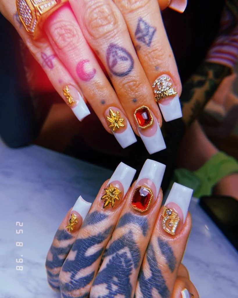 Cande Tinelli compartió imágenes con el último nail art que se hizo y vimos que es realmente jugado: uñas XL con punta cuadrada, francesita extra bold y en cada uña llevaba pegado un detalle bijou diferente. Algunos eran simplemente dorados, otros tenían piedras o strass.