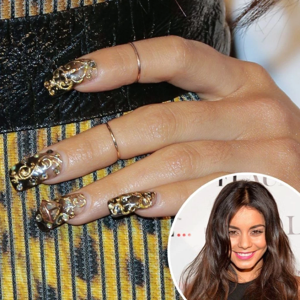 Por su parte, Vanesa Hudgens eligió el dorado sobre sus uñas fumé, haciendo match con los tonos de su outfit.