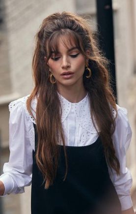Con el pelo bien largo, haciendo una media cola con volumen. Se logra batiendo con un peine fino la parte de la raíz que vas a sujetar. Además, dejás parte del flequillo suelto , que caiga naturalmente hacia el frente y los laterales.