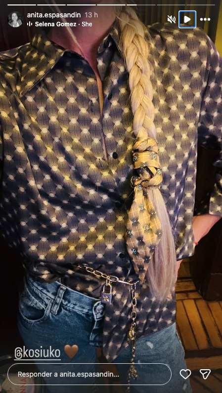 Para su paso por BAFWEEK, donde asistió al desfile de Kosiuko, Anita Espasandin apostó por un peinado que no pasó desapercibido: una trenza larga y pulida que en realidad era postiza.