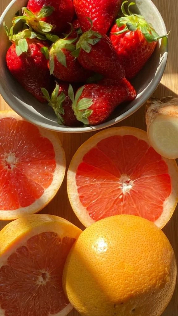 El hecho de incorpora los cítricos en nuestra dieta diaria nos asegura una gran cantidad de vitamina C y antioxidantes. La frutilla es rica en vitamina A, C, del grupo B y minerales. Al ser una fruta depurativa, ayuda a reducir el exceso de grasa en la piel y a aliviar los síntomas del acné. También nos ayuda como antiarrugas porque contiene antocianinas, además de betacaroteno, ácido fólico, potasio, calcio y magnesio.