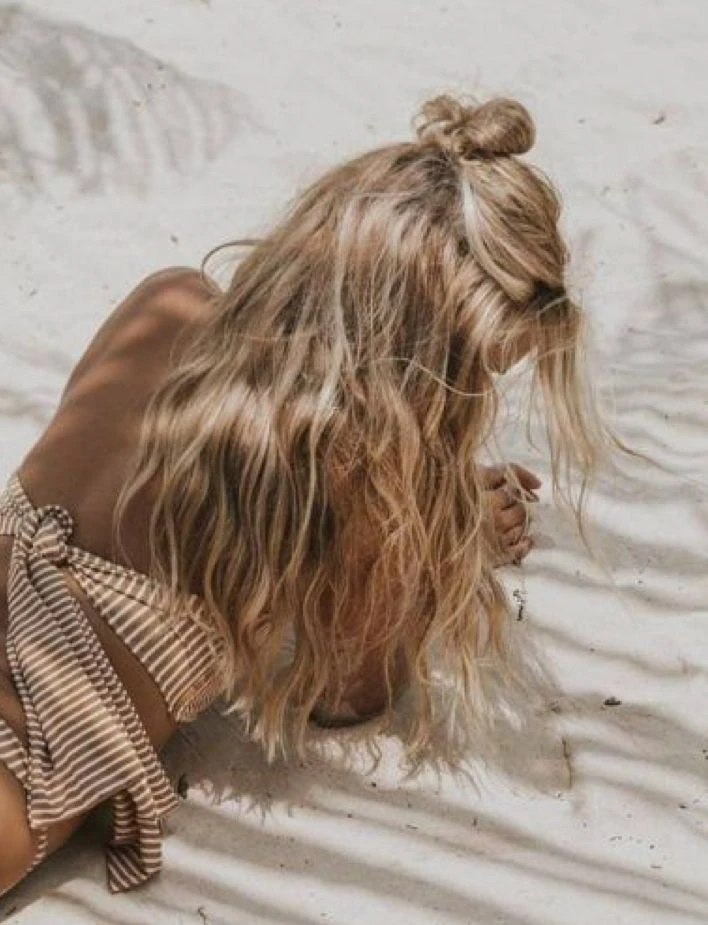 Descontracturado y con espíritu boho, este rodete se lleva alto y pequeño, dejando el resto del pelo suelto con textura natural. Es ideal para la playa porque combina comodidad y frescura sin perder movimiento. Se arma rápido, funciona mejor con ondas saladas y acepta el frizz como parte del look. El resultado: un peinado relajado, canchero y muy summer mood, perfecto para pasar del mar a la reposera sin retoques.